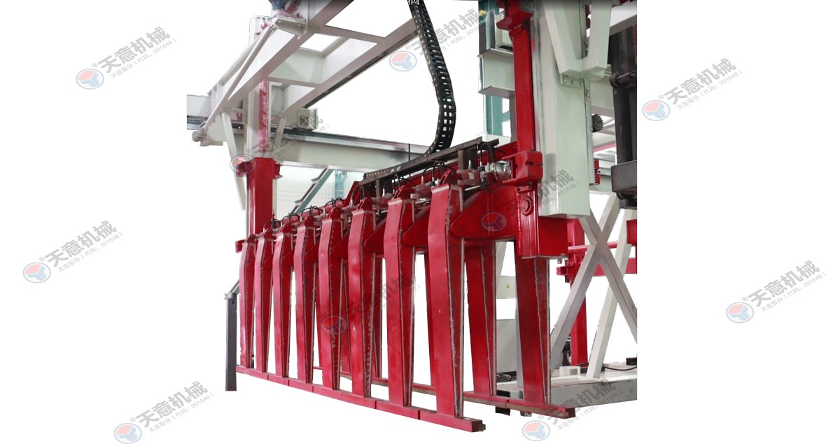成品分垛吊機:將蒸養(yǎng)車上的一模坯體吊運至掰板輸送機上,然后將空側(cè)板吊運至蒸養(yǎng)車上;切割工段空翻脫模機將??蚍D(zhuǎn)90°,放在切割小車支座上進(jìn)行脫模,脫模后的??蚺c清理后的側(cè)模板進(jìn)行合模,合膜后的空模框被吊...