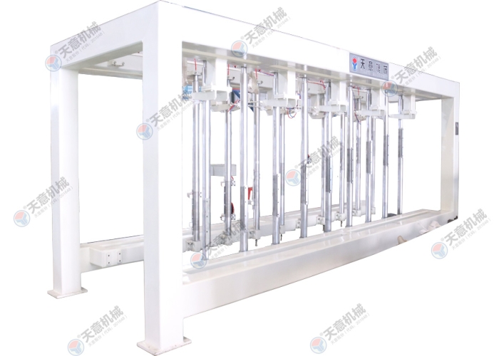 脫模后的坯體連同側(cè)板一起放置在切割小車上,切割小車由減速電機驅(qū)動行走,通過縱向切割機完成縱向切割,切割小車繼續(xù)行走至橫向 切割機中間位置停止后,由小車置換裝置將側(cè)板連同坯體抬起,切割小車退回翻轉(zhuǎn)行車底下進行下一次承載脫模后的坯體,另外一部切割小車 進入置換裝置底下后, 置換裝置將側(cè)板連同坯體放置該切割小車上后,橫向切割動作后啟動進行橫向切割動作,切割完成后,切割小車再行走至確地行車底下,再由 翻轉(zhuǎn)去底行車將坯體去底(連側(cè)板)吊至蒸養(yǎng)小車上,切割小車范圍原始位置進行下一個切割循環(huán)。