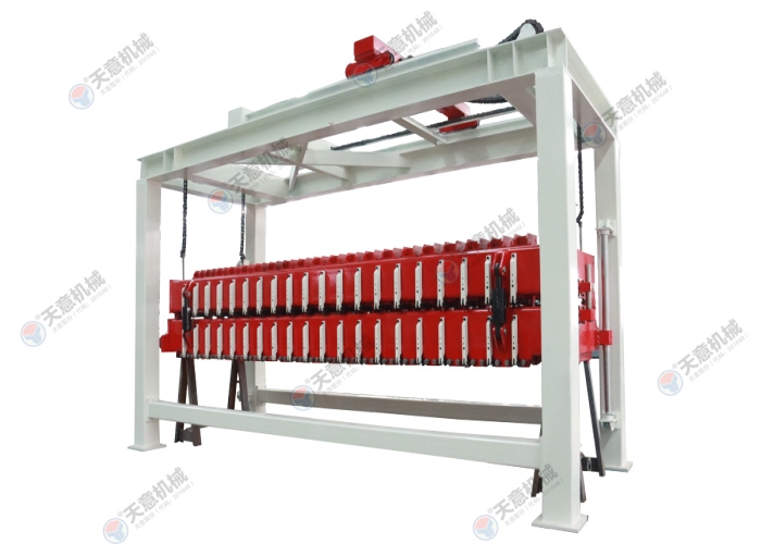 脫模后的坯體連同側(cè)板一起放置在切割小車(chē)上,切割小車(chē)由減速電機(jī)驅(qū)動(dòng)行走,通過(guò)縱向切割機(jī)完成縱向切割,切割小車(chē)?yán)^續(xù)行走至橫向 切割機(jī)中間位置停止后,由小車(chē)置換裝置將側(cè)板連同坯體抬起,切割小車(chē)退回翻轉(zhuǎn)行車(chē)底下進(jìn)行下一次承載脫模后的坯體,另外一部切割小車(chē) 進(jìn)入置換裝置底下后, 置換裝置將側(cè)板連同坯體放置該切割小車(chē)上后,橫向切割動(dòng)作后啟動(dòng)進(jìn)行橫向切割動(dòng)作,切割完成后,切割小車(chē)再行走至確地行車(chē)底下,再由 翻轉(zhuǎn)去底行車(chē)將坯體去底(連側(cè)板)吊至蒸養(yǎng)小車(chē)上,切割小車(chē)范圍原始位置進(jìn)行下一個(gè)切割循環(huán)。