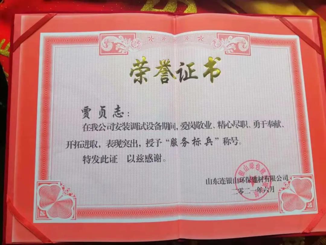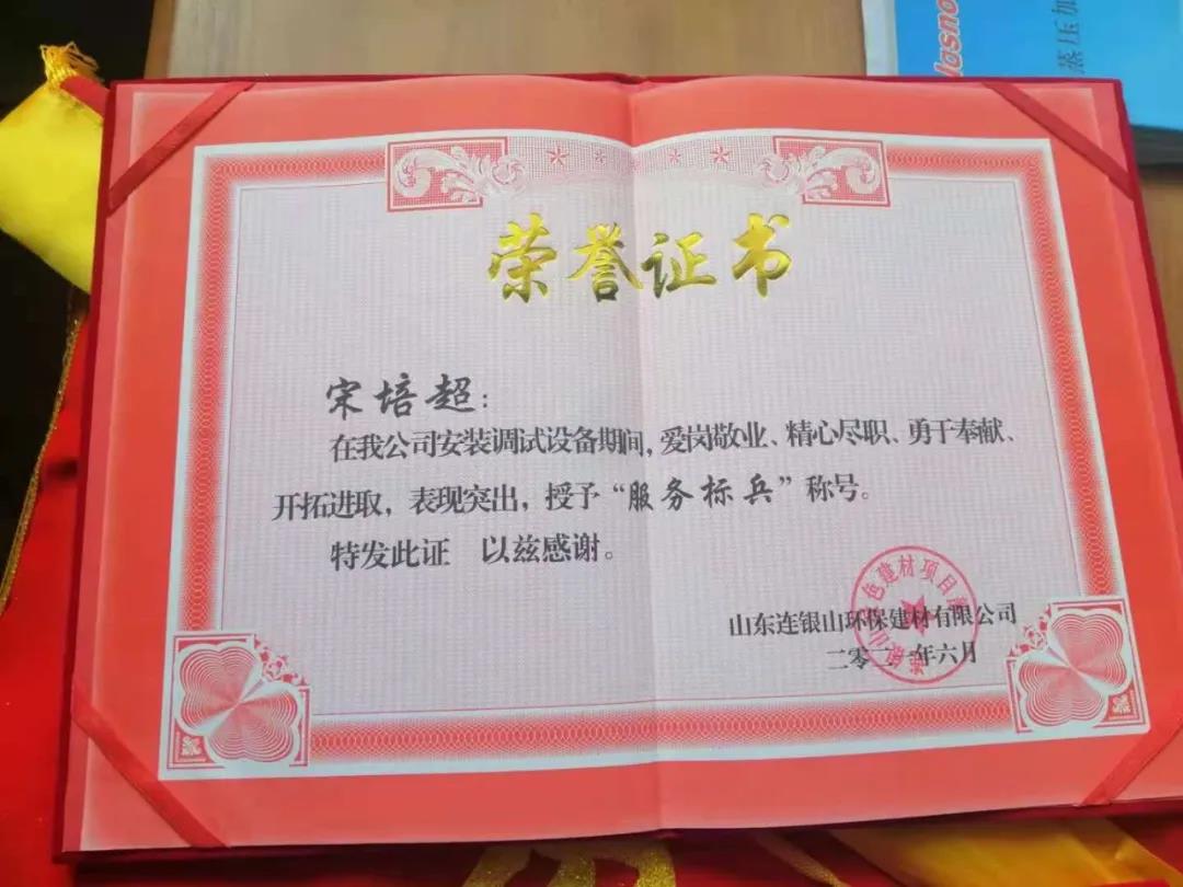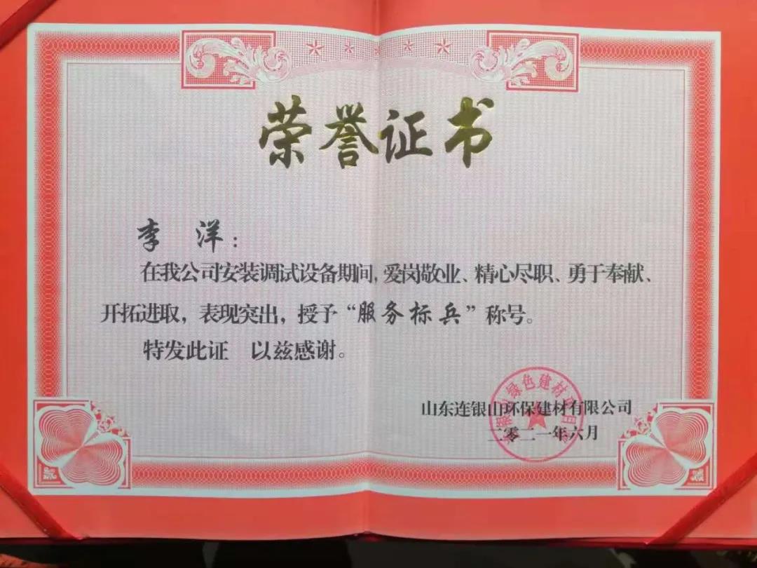 炎炎夏日,天意機械在向客戶山東連銀山環(huán)保建材有限公司售出保溫裝飾一體化板生產線之后,隨即派出售后團隊對設備進行安裝調試及售后培訓。售后團隊不畏酷暑,精心、耐心、專業(yè)地為客戶進行安裝調試,贏得了客戶的好評和認可,客戶為表達謝意,特授予天意機械售后人員榮譽證書和錦旗,以表彰售后人員愛崗敬業(yè)、精心盡職、勇于奉獻、開拓進取的精神。