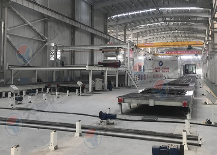 PC環(huán)形疊合板生產(chǎn)線采用高精度、高結(jié)構(gòu)強(qiáng)度的成型模具,經(jīng)自動布料機(jī)把混凝土澆筑其中、振動臺振搗后并不立即脫模,而是經(jīng)預(yù)養(yǎng)護(hù)、蒸汽養(yǎng)護(hù),使構(gòu)件強(qiáng)度滿足設(shè)計強(qiáng)度時才進(jìn)行拆模處理,拆模后的成品構(gòu)件運(yùn)輸至成品暫存區(qū)或室外堆場,而空模臺沿輸送線自動返回,形成自動化環(huán)形流水作業(yè)。
